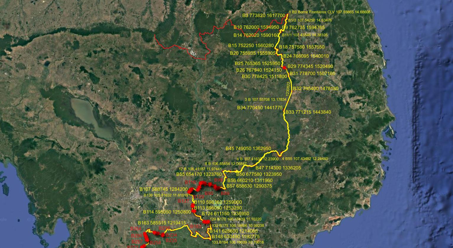 Les bornes théoriques, marquées d’un point rouge, dont les coordonnées avaient été déterminées selon le traité de 1985 entre le Cambodge et le Vietnam.