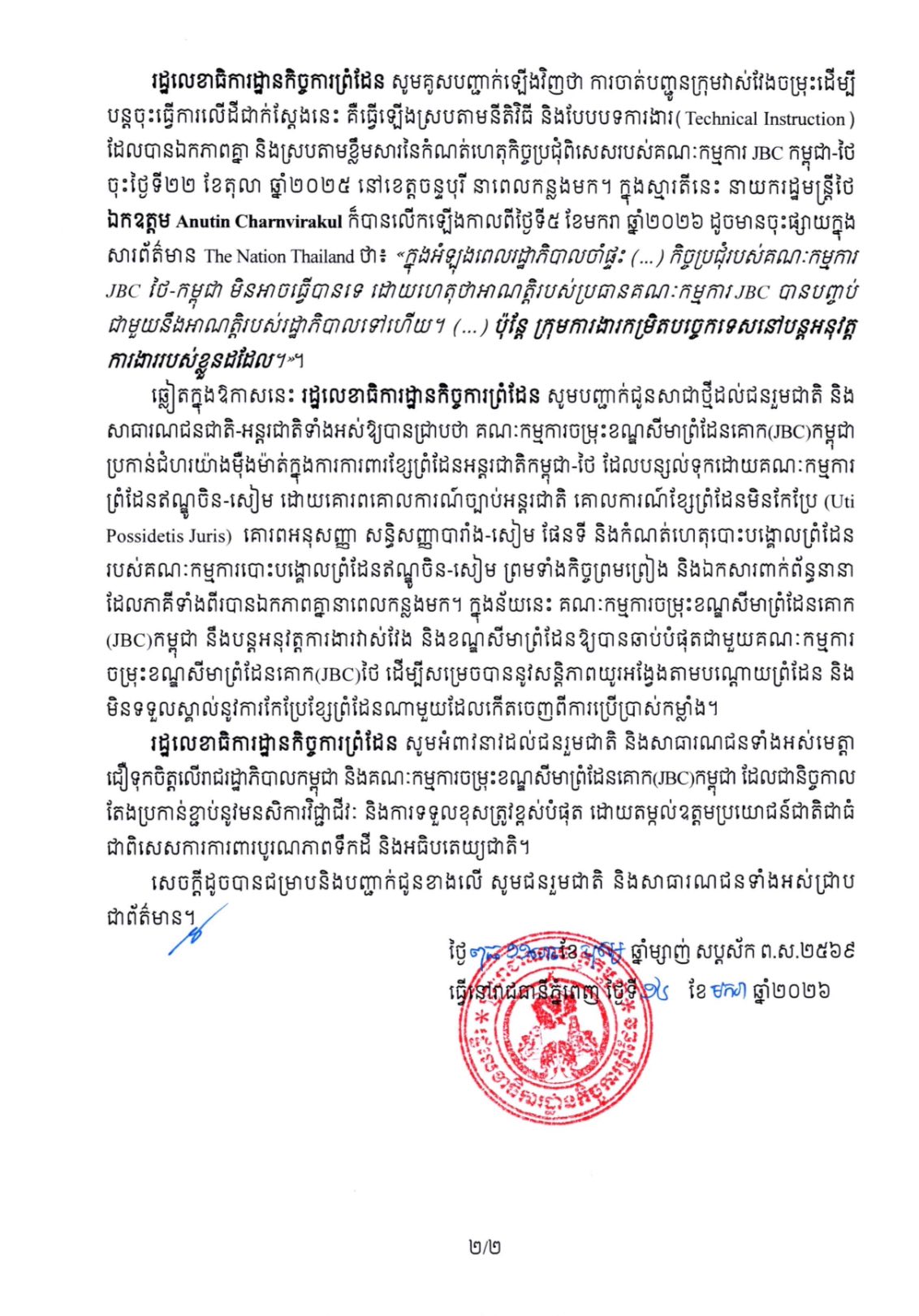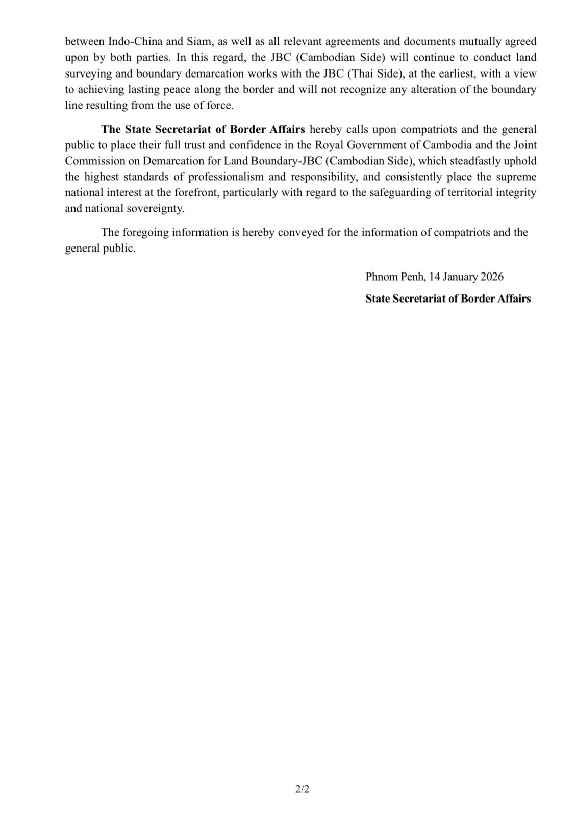 Dans son Communiqué du 14 Janvier 2025, Le Secrétariat d’État aux Affaires Frontalières cambodgien réitère sa demande de convocation de la Commission Mixte des Frontières Khméro-Thaïlandaise pour accélérer la résolution des conflits frontaliers avec la Thaïlande, notamment dans les zones situées entre les Bornes 42-47 et les bornes 52-59.