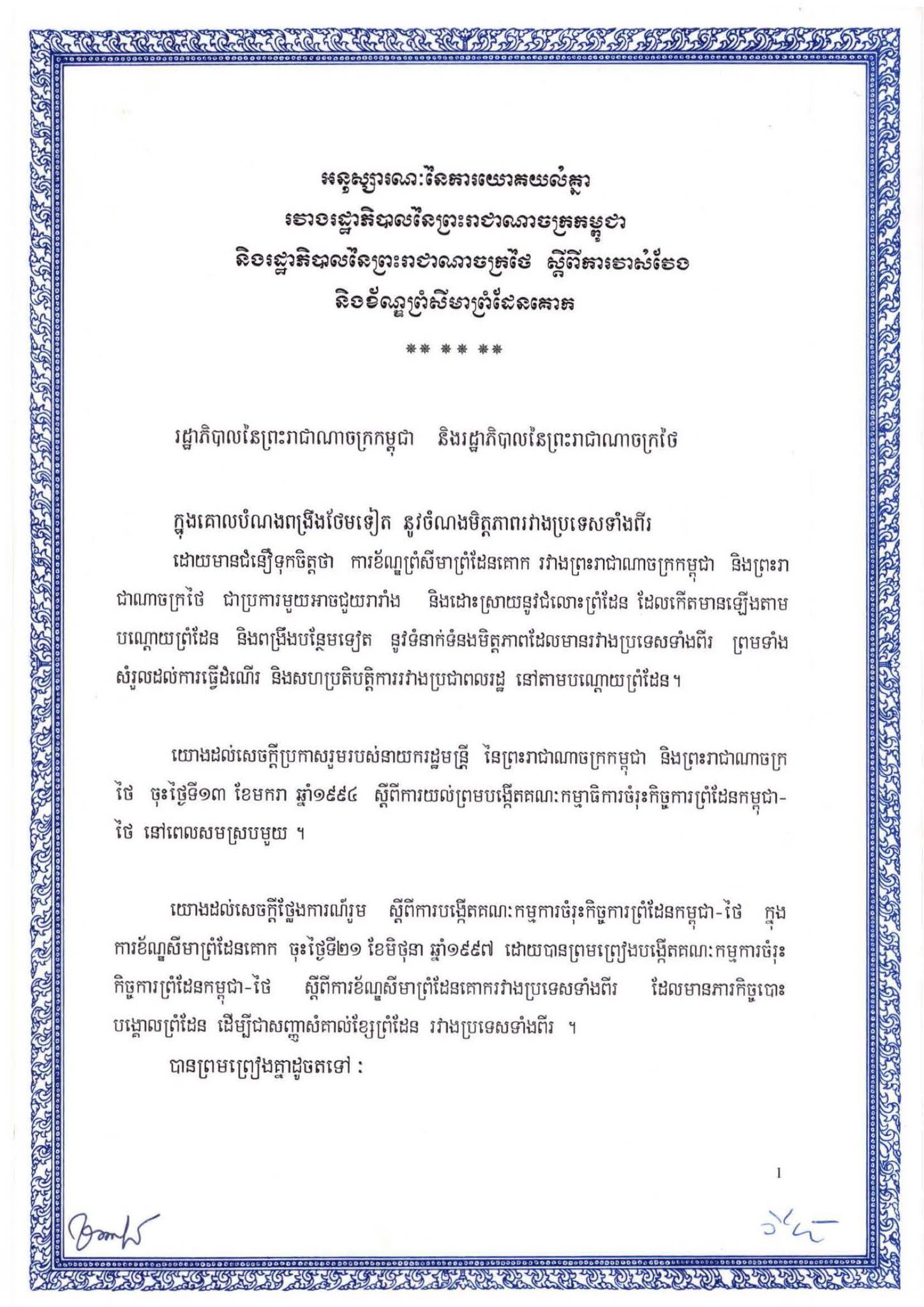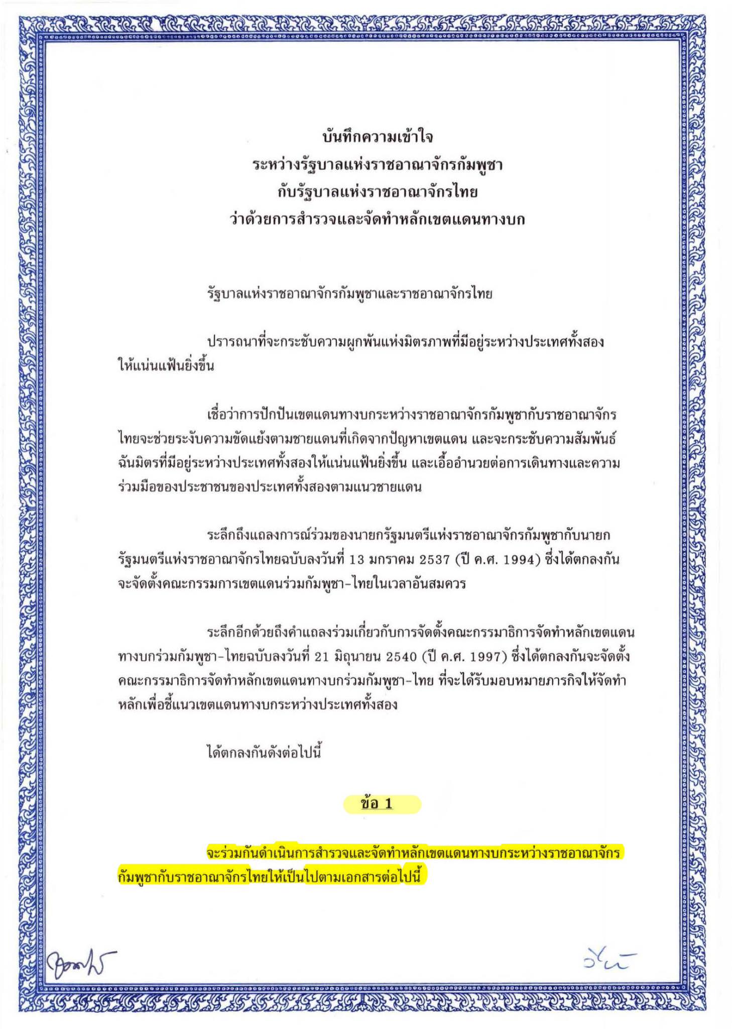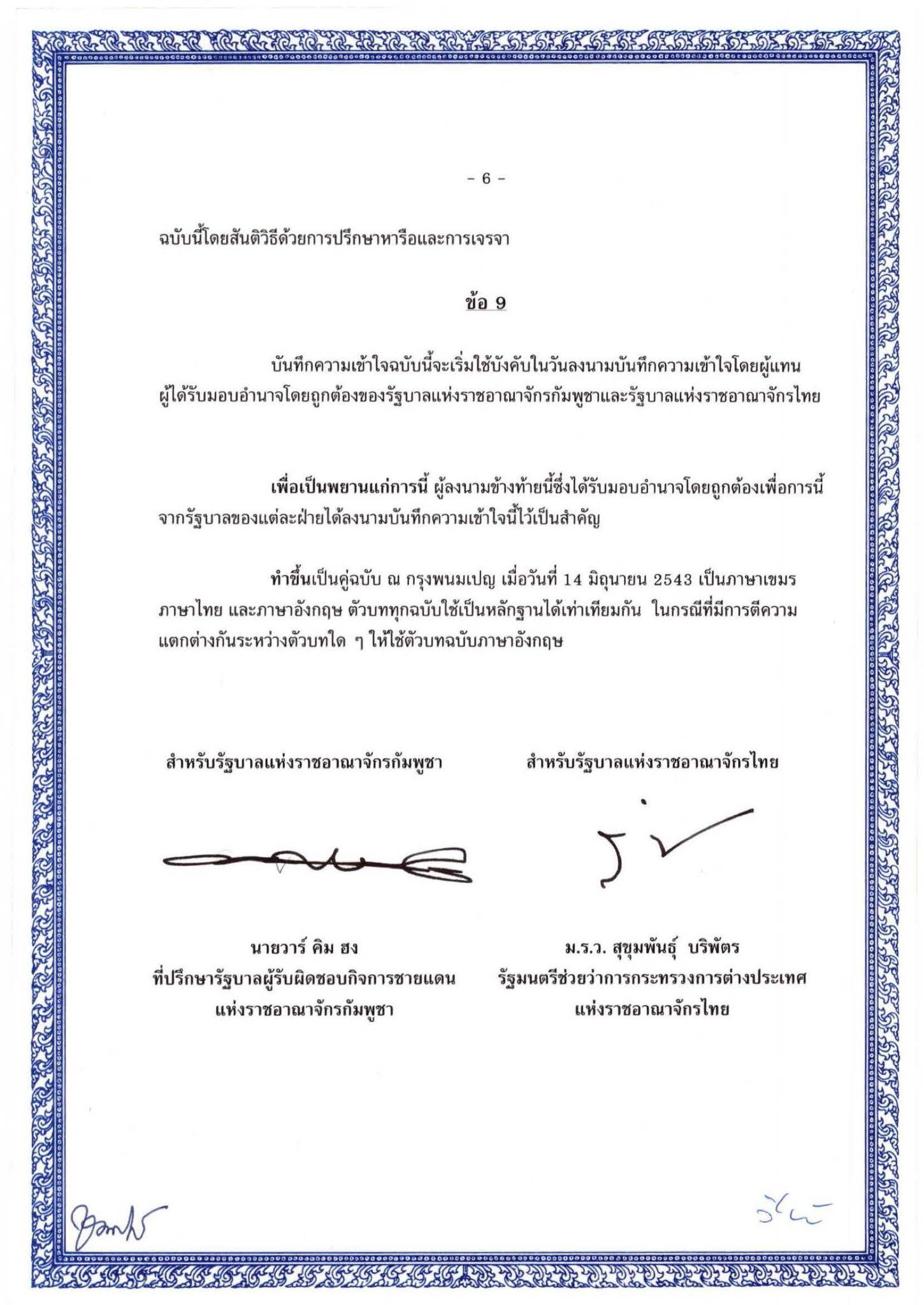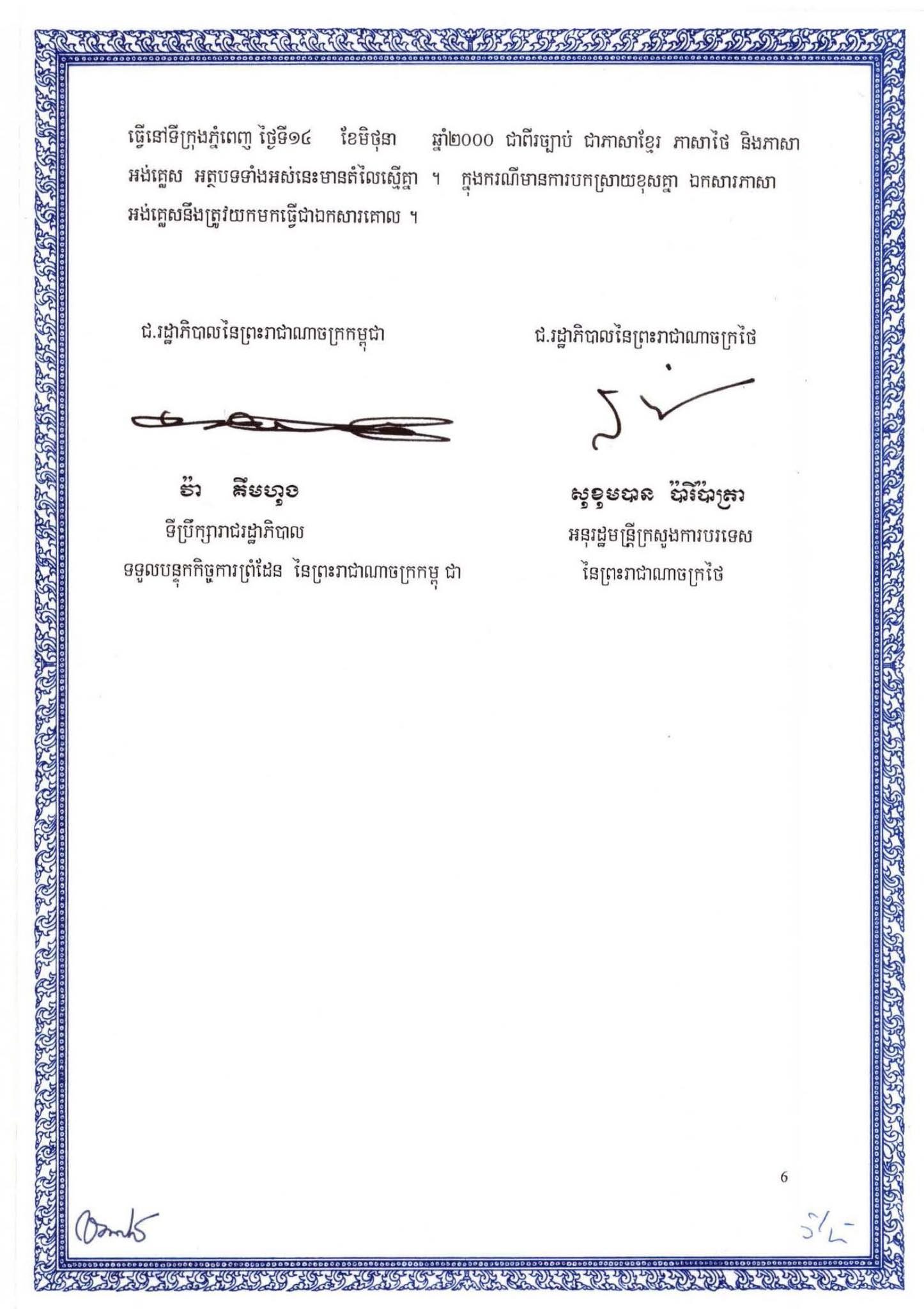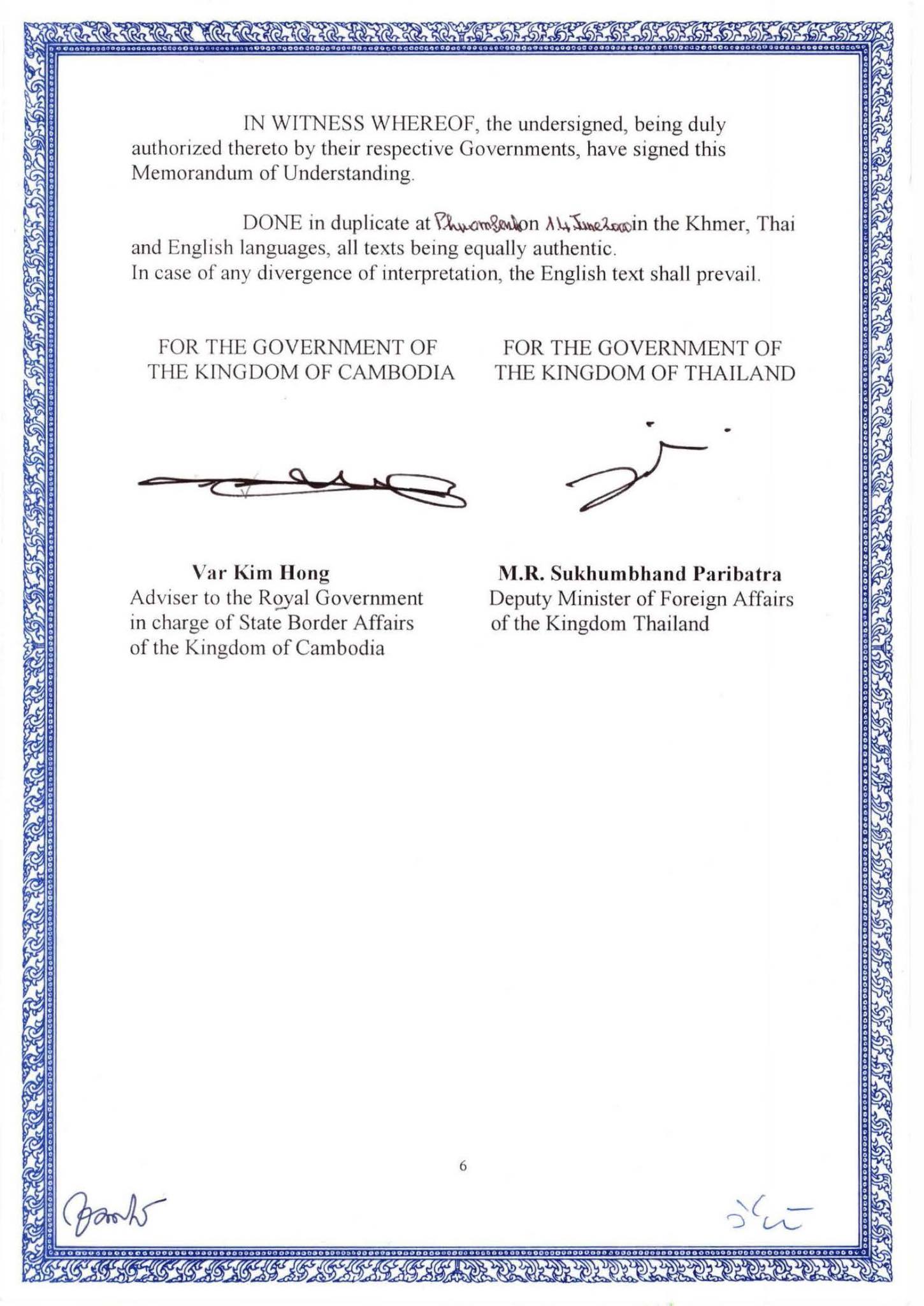 Memorandum of Understanding between the Government of the Kingdom of Cambodia and the Government of the Kingdom of Thailand on the Survey and Demarcation of land Boundary, which both sides officially signed on 14th June 2000 (MoU2000).